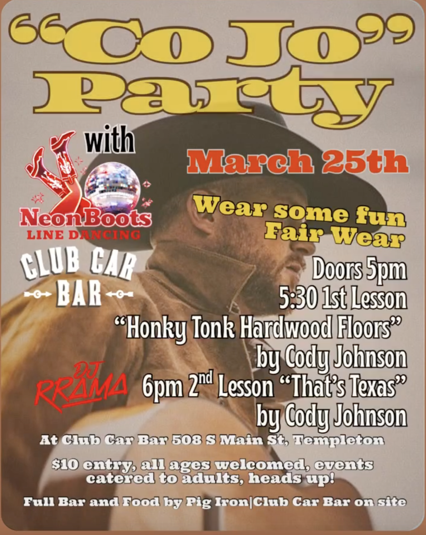 We love our Cody Johnson and we know you do, too! Let’s celebrate with a night dedicated to CoJo! Doors 5pm 5:30 Learn “Honky Tonk Floors” (High Improver/Tara Bianco for our step sheet friends) with Roxy 6pm Learn “That’s Texas” (15 min lesson) with Riley Social line and swing from 7-9pm