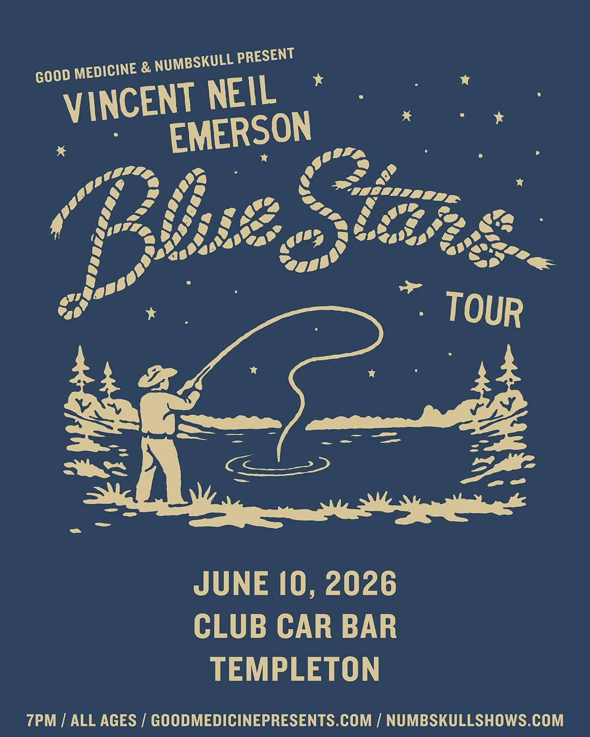 “Vincent Neil Emerson is a songwriter from East Texas. His debut album Fried Chicken and Evil Women was released in 2019 on La Honda Records. Since then his music has appeared in numerous television shows and movies, including Yellowstone and Landman. Also to his credit is a self-titled record produced by Rodney Crowell and the recent Golden Crystal Kingdom produced by Shooter Jennings. His newest and fourth full length album, Blue Stars, releases April 17th. The first single “Jet Plane” is now streaming everywhere.”